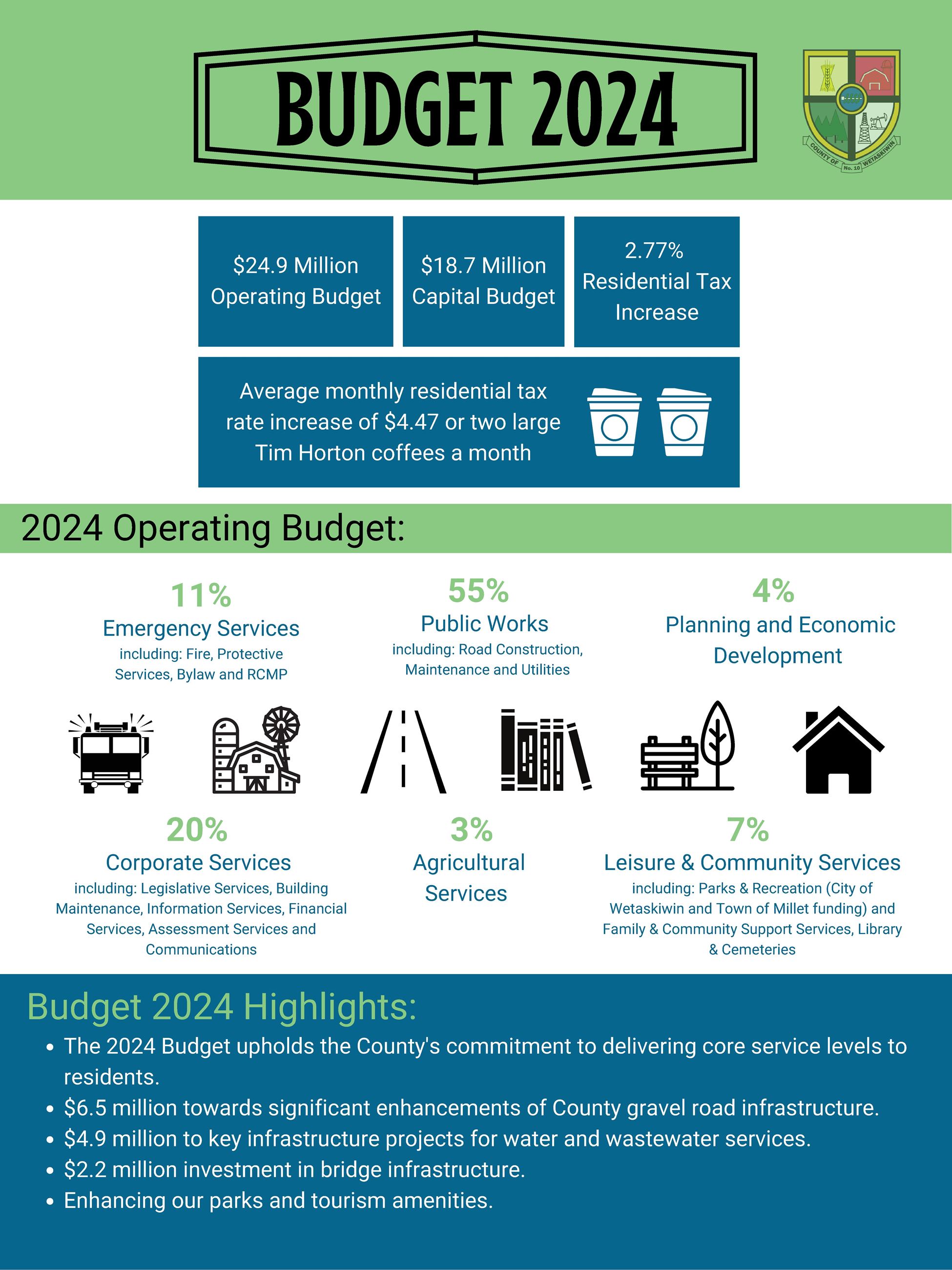 On May 21, 2024, the Council of the County of Wetaskiwin No. 10 approved the Mill Rates for 2024 to fund the year's final budget. The overall budget for the County stands at $45.8 million, with municipal tax support contributing $24.9 million.