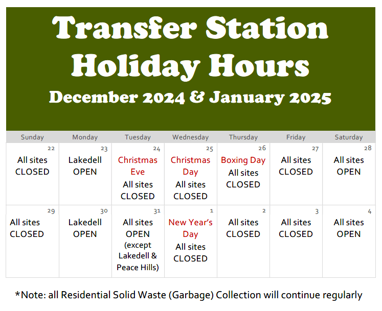 All transfer stations will be CLOSED on December 24, 25, 26, 2024 and January 1, 2025.