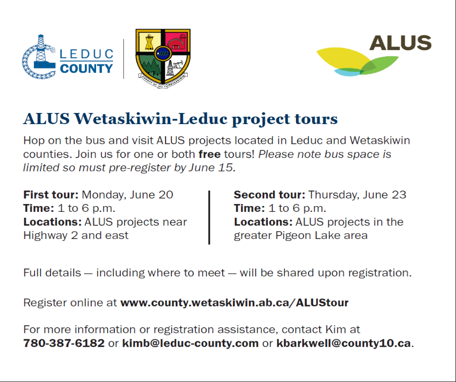 Hop on the bus and visit established ALUS projects in Wetaskiwin and Leduc counties! Join us for one or both free tours. Use the on-line form to pre-register by June 15. For pre-registration assistance or more information, contact Kim by phone at 780-387-6182 or email