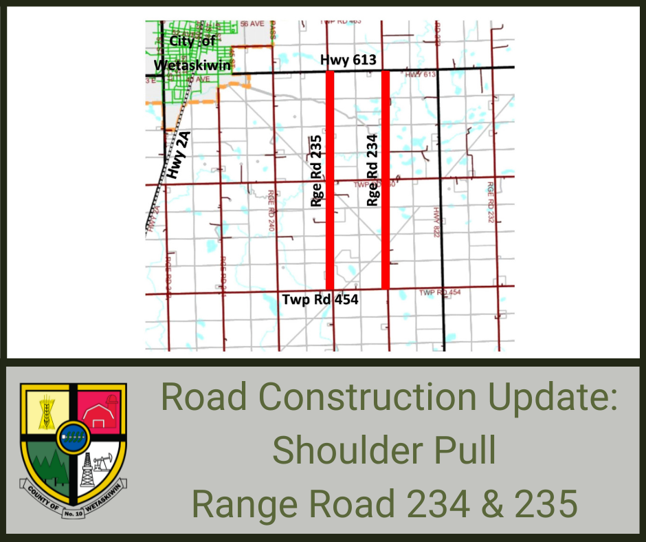 This project is a shoulder pull on Range Road 234 (6.4 km) and Range Road 235 (6.4 km) between Township Road 454 and Highway 613 by Central Construction Group Ltd. has been contracted to complete this work. Work involved includes shoulder pull, spot road repairs and gravelling.