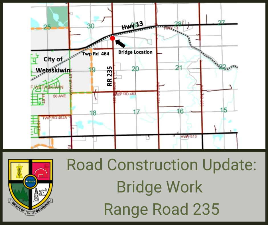 The County is preparing to undertake upgrades to a bridge on Range Road 235 between Highway 13 & Township Road 464. This project is scheduled to begin during July-August 2022 and will take up to three (3) weeks to complete. Please note, this project is weather dependent, and the start and end date is subject to change. The bridge will be closed to all traffic for the duration of the project and detour signs will be in place.