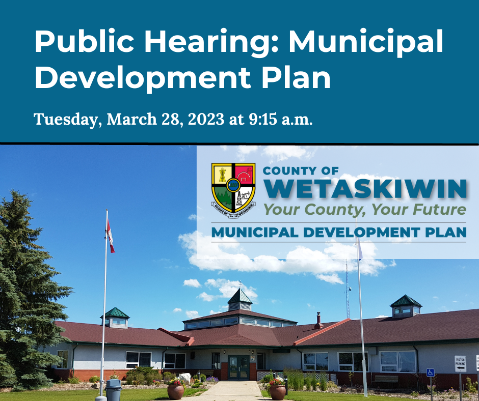 TAKE NOTICE that the Council of the County of Wetaskiwin No.10 will be holding a Public Hearing to review the proposed Municipal Development Plan (MDP).