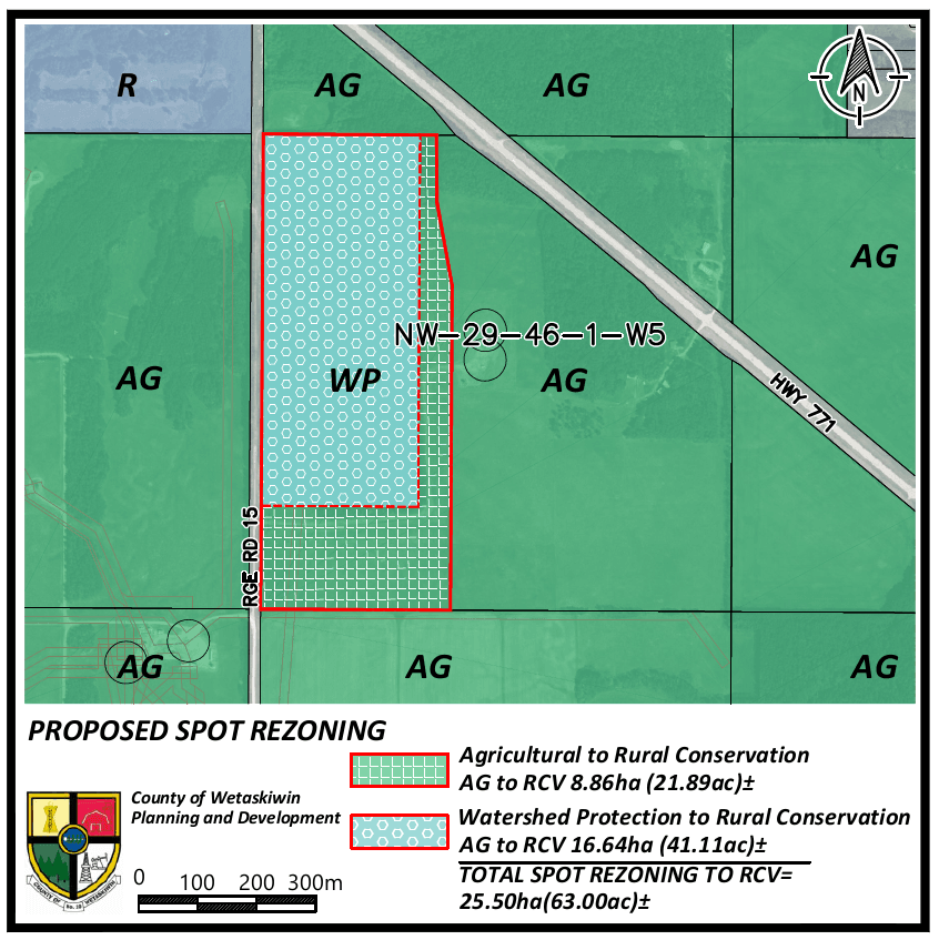 TAKE NOTICE that the Council of the County of Wetaskiwin No. 10 has received an application to amend its Land Use By-Law by rezoning part of the following land, as shown on the accompanying map, from Agricultural (AG) AND Watershed Protection (WP) to Rural Conservation (RCV).