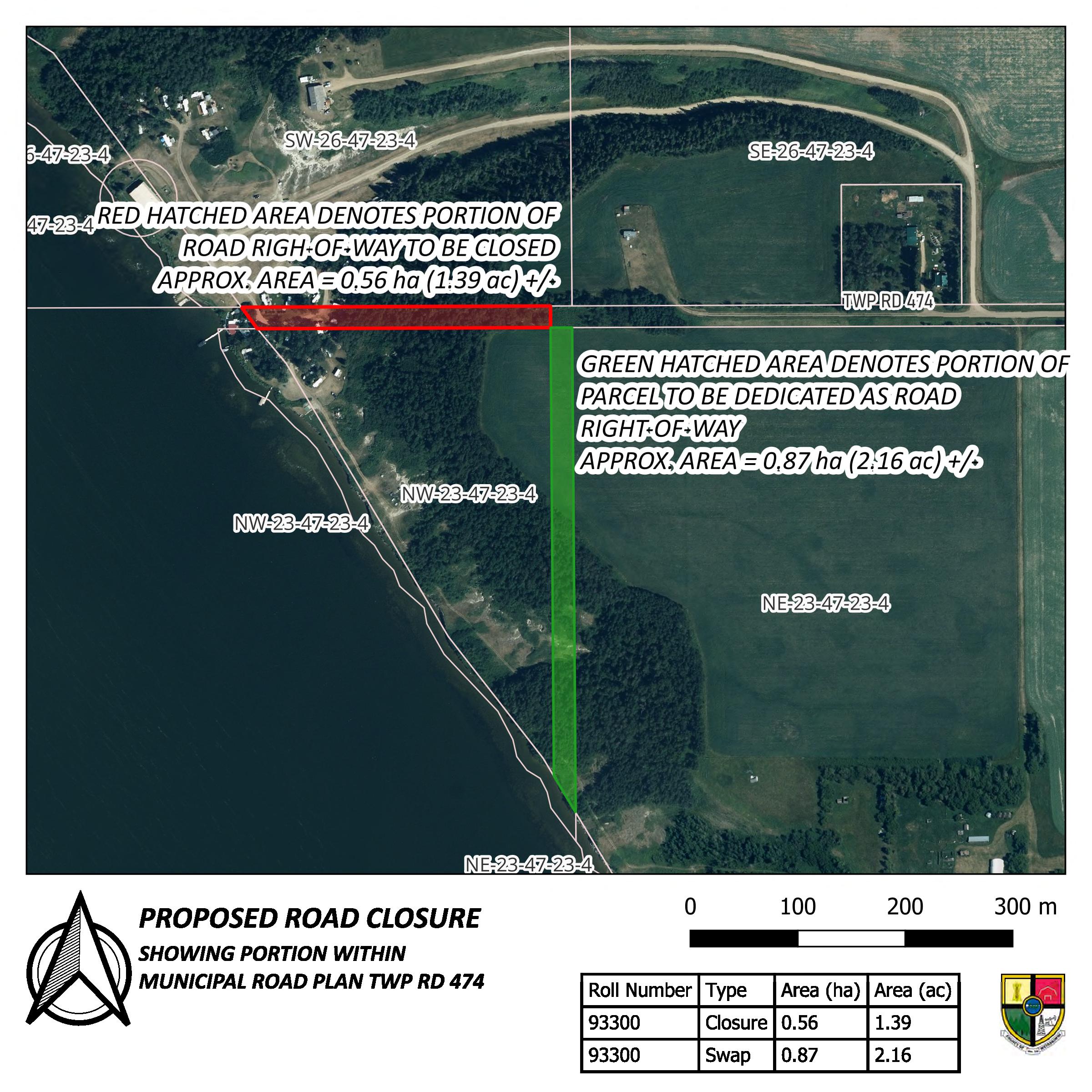 • Bylaw 2024/16 whereby the portion of road allowance on the top of the slope crook road portion of Twp Rd 474 of NW 23-47-23-W4M is to be closed to public travel and sold.93300 map