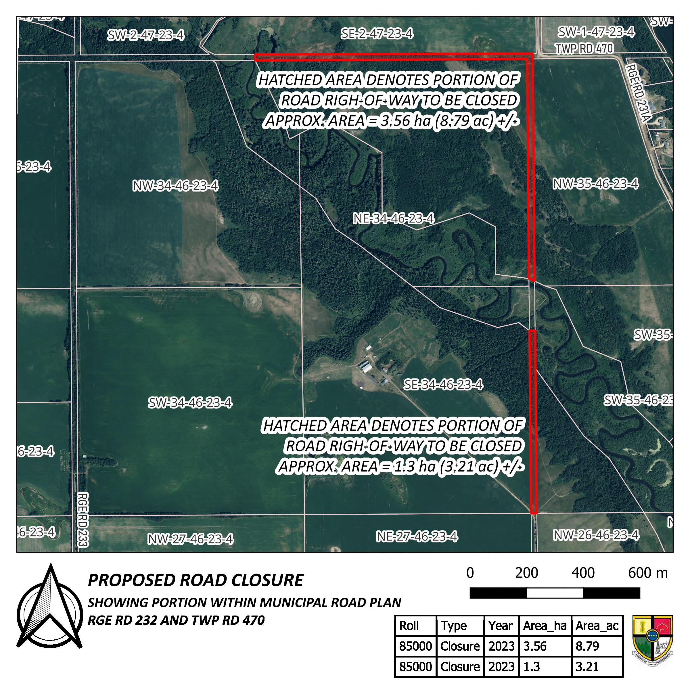 • Bylaw 2024/15 whereby the portion of road allowance on Rge Rd 232 from Twp Rd 470 South 1 mile & Twp Rd 470 from Rge Rd 232 West to the creek, SE 02-47-23-W4M, is to be closed to public travel and sold.85002 map