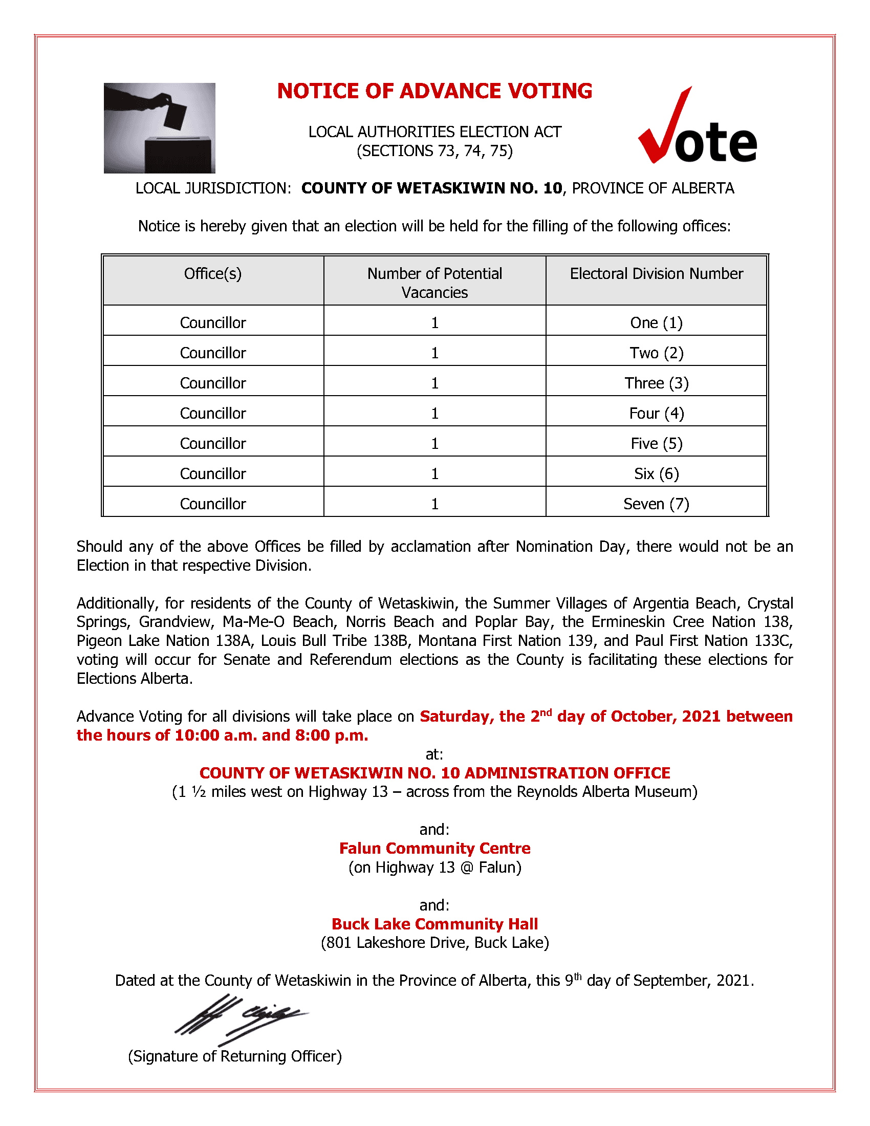 Advance Voting for all divisions will take place on Saturday,the 2ndday of October,2021 between the hours of 10:00 a.m. and 8:00 p.m.at:COUNTY OF WETASKIWIN NO. 10 ADMINISTRATION OFFICE(1 ½ miles west on Highway 13 –across from the Reynolds Alberta Museum)and:Falun Community Centre(on Highway 13 @ Falun)and:Buck Lake Community Hall(801 Lakeshore Drive, Buck Lake)