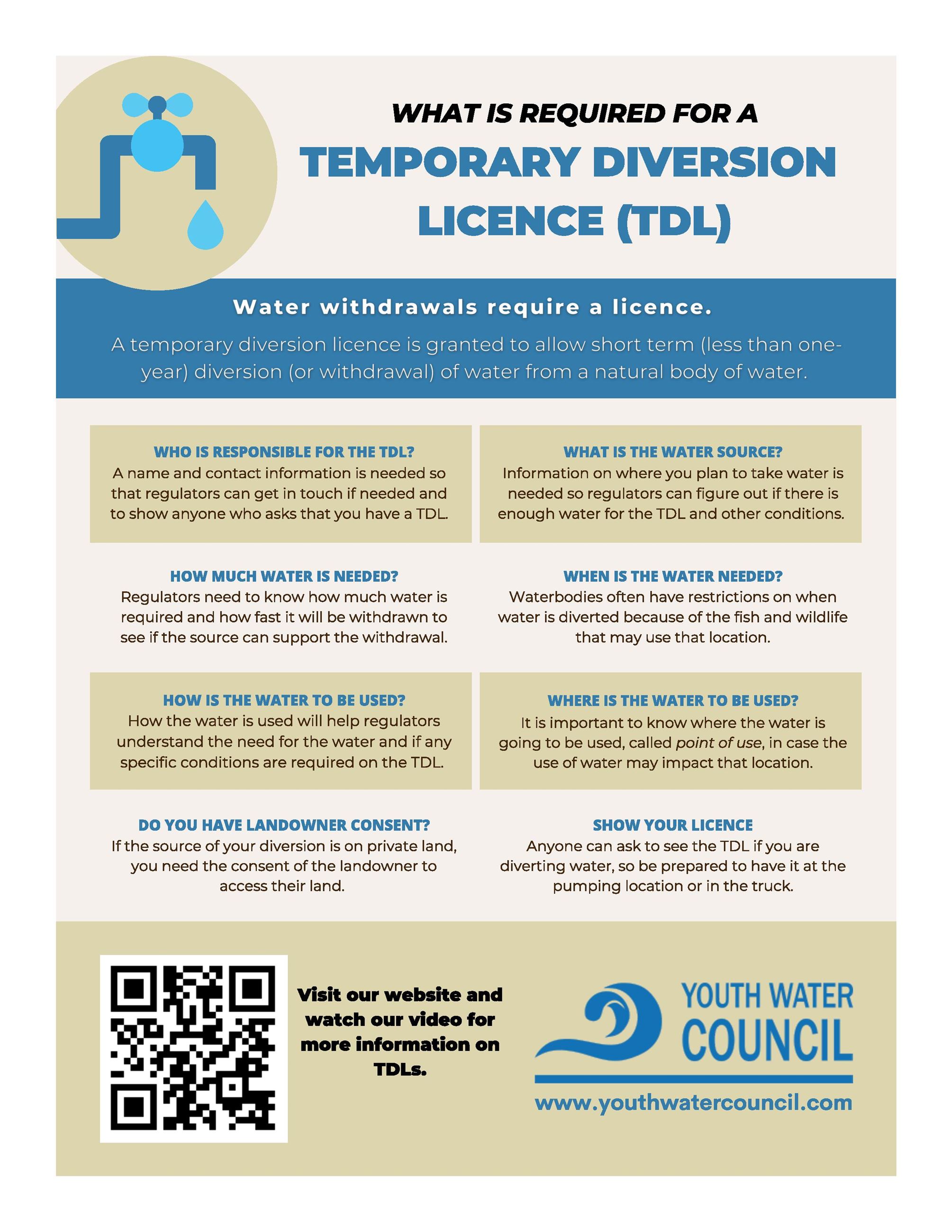 The Youth Water Council, a group of 10 rural teen 4-H members from Alberta, took on the challenge of raising awareness of temporary water diversion licenses and their importance. The Council learned about temporary diversion licences or TDLs from experts and landowners, and then planned and created a video and infographics to raise awareness. View the video here.