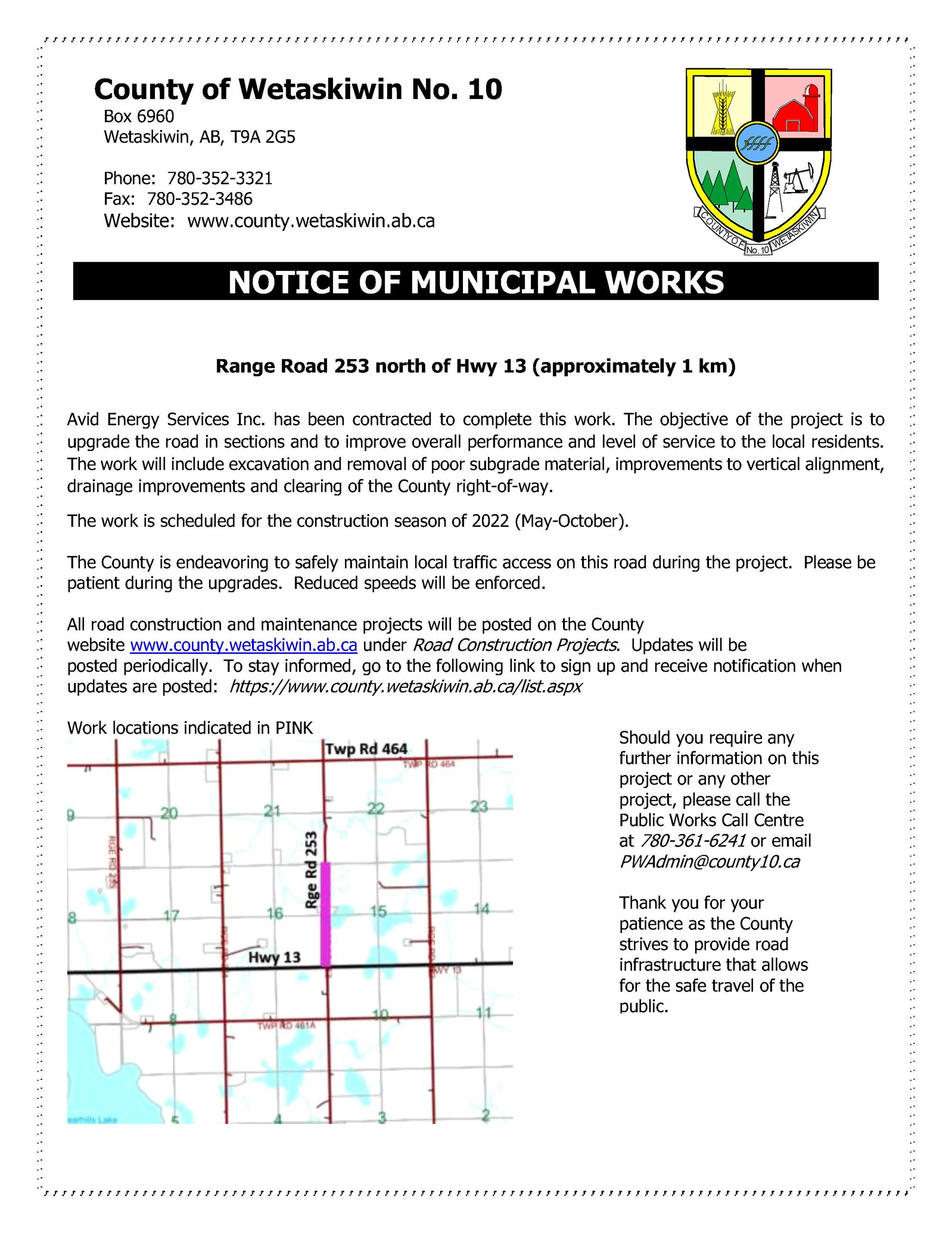 Avid Energy Services Inc. has been contracted to complete this work. The objective of the project is to upgrade the road in sections and to improve overall performance and level of service to the local residents. The work will include excavation and removal of poor subgrade material, improvements to vertical alignment, drainage improvements and clearing of the County right-of-way. Work is scheduled to start August-September 2022.