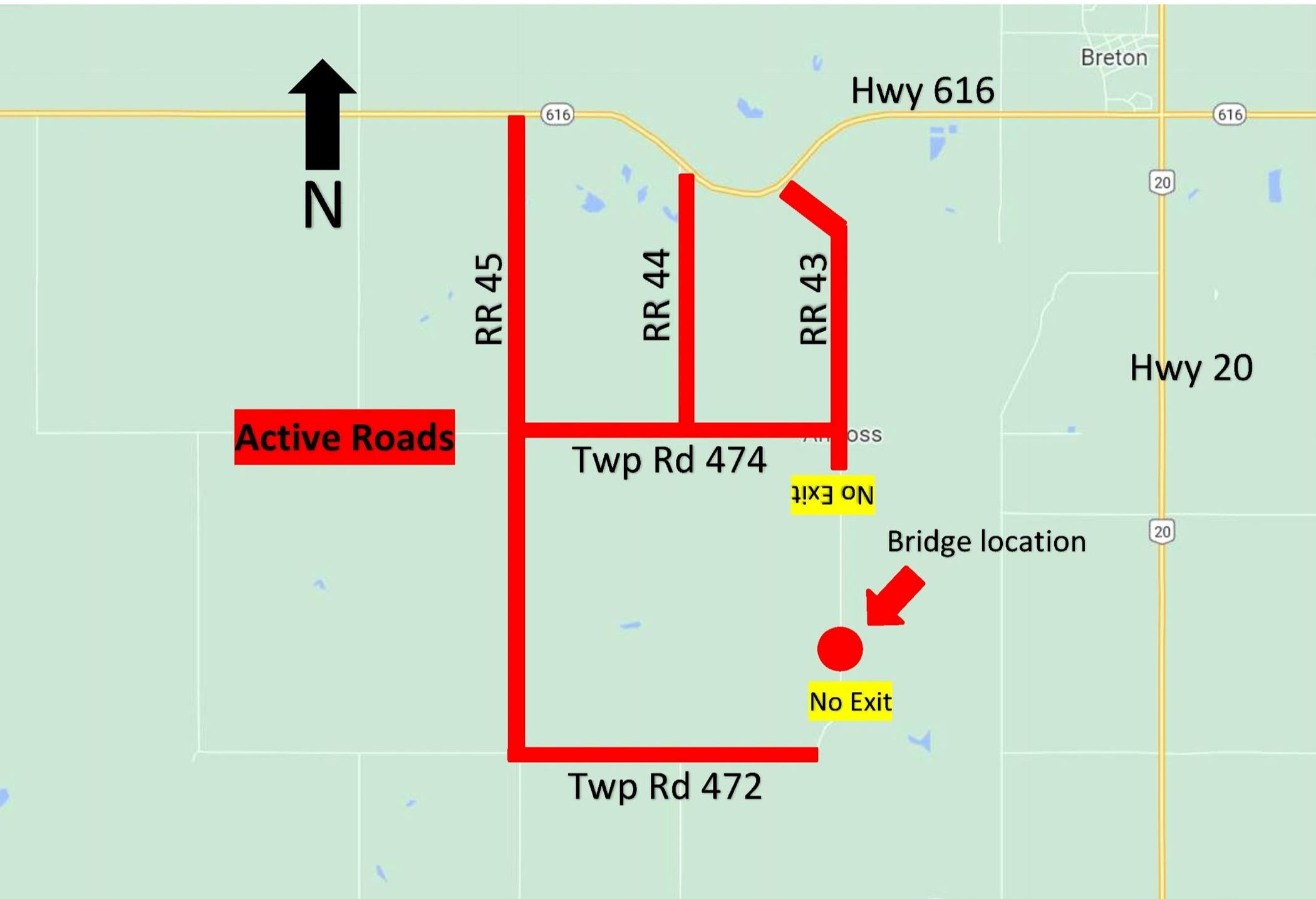 The County of Wetaskiwin has issued a temporary road closure on RANGE ROAD 43 between TOWNSHIP ROAD 472 and TOWNSHIP ROAD 474 in the Province of Alberta, from 8:00 a.m., Thursday, September 1, 2022 until 5:00 p.m., Tuesday, September 20, 2022 due to a bridge replacement. The roads marked in red on the map below are open and available as alternative routes.