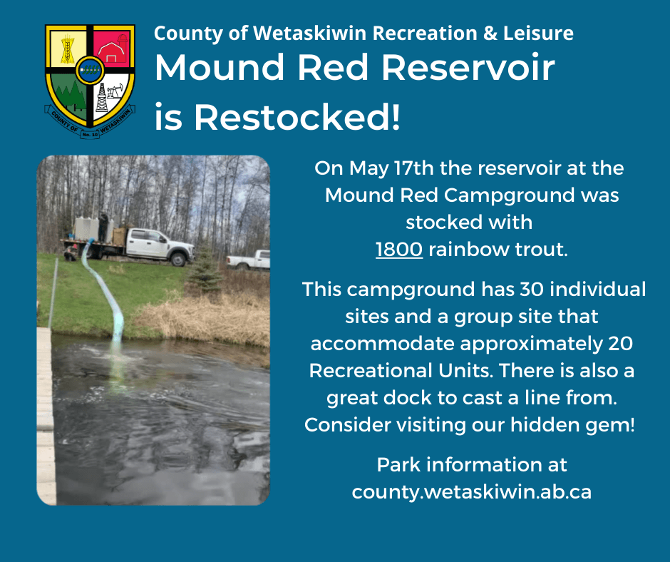 On May 17th the reservoir at the Mound Red Campground was stocked with 1800 rainbow trout. The water's oxygen levels are high and some large fish have been spotted jumping.
